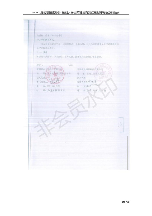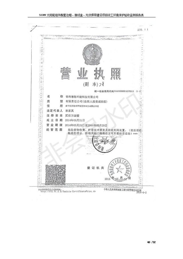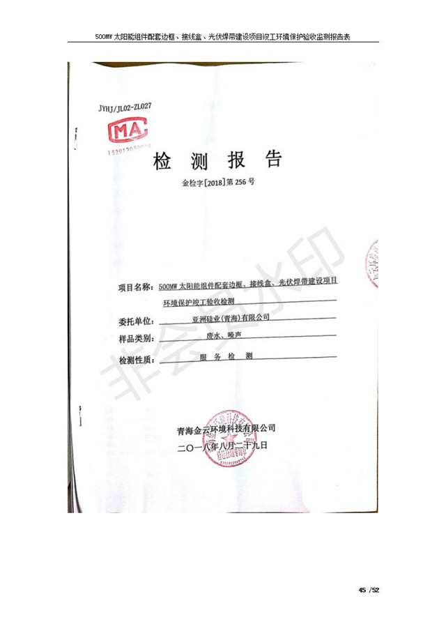 500MW太陽能組件配套邊框、接線盒、光伏焊帶建設項目竣工環(huán)境保護驗收監(jiān)測報告表公示發(fā)布日期:(2018-11-16) 點擊次數:2161 |