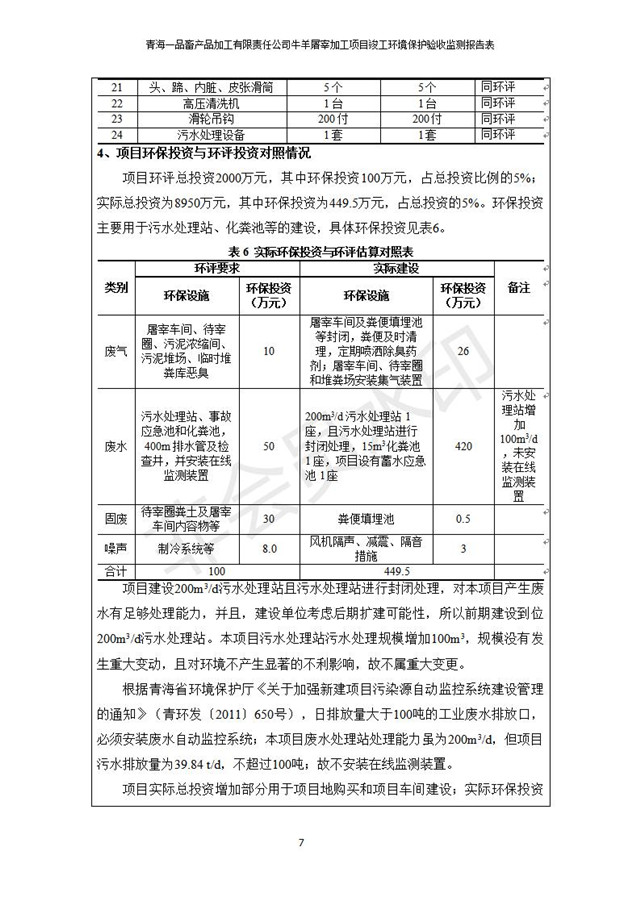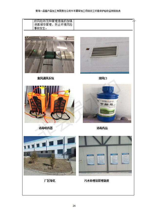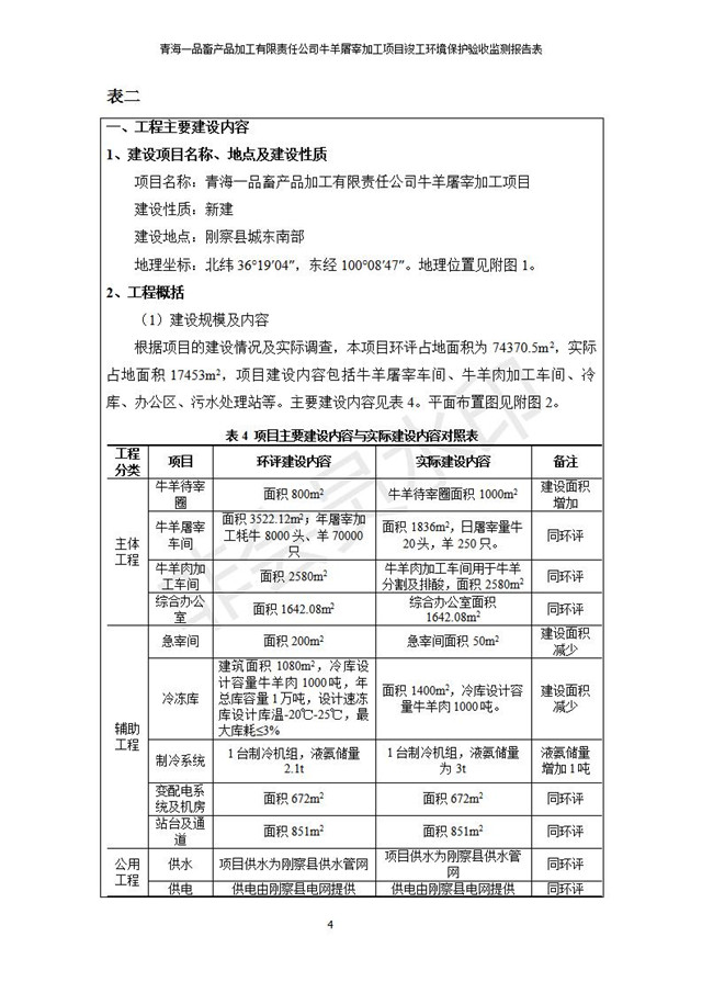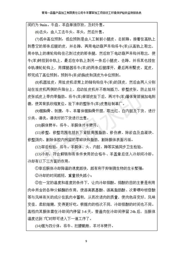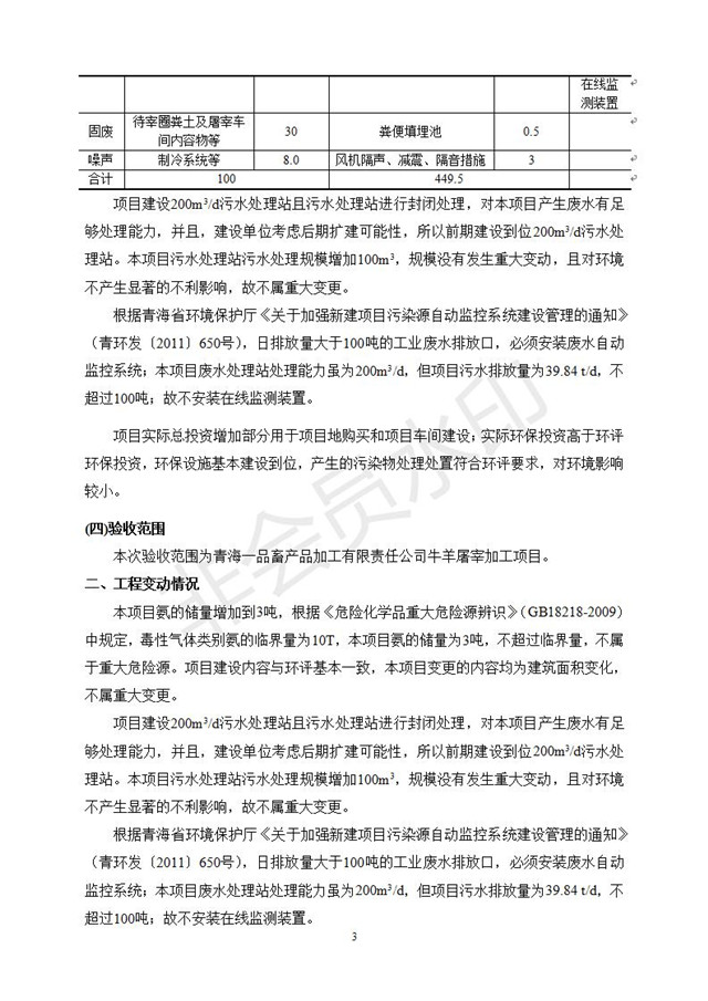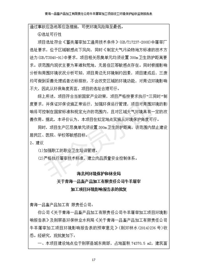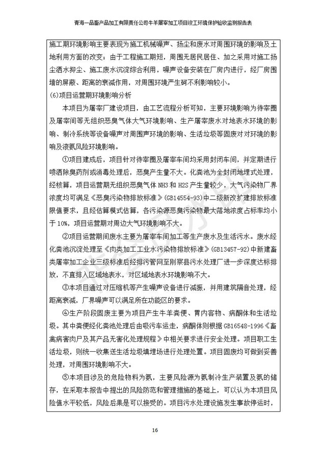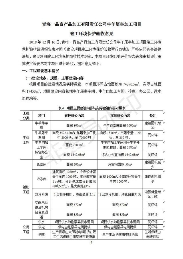根據(jù)中華人民共和國國務(wù)院令第682號《國務(wù)院關(guān)于修改〈建設(shè)項(xiàng)目環(huán)境保護(hù)管理?xiàng)l例〉的決定》和《建設(shè)項(xiàng)目竣工環(huán)境保護(hù)驗(yàn)收暫行辦法》(國務(wù)院令682號),青海一品畜產(chǎn)品加工有限責(zé)任公司牛羊屠宰加工項(xiàng)目(包括竣工環(huán)境保護(hù)驗(yàn)收監(jiān)測報(bào)告表和驗(yàn)收意見)公示如下。 一、項(xiàng)目名稱:青海一品畜產(chǎn)品加工有限責(zé)任公司牛羊屠宰加工項(xiàng)目竣工環(huán)境保護(hù)驗(yàn)收監(jiān)測報(bào)告表 二、地點(diǎn):剛察縣縣城東大街加油站東側(cè) 三、建設(shè)單位:青海一品畜產(chǎn)品加工有限責(zé)任公司 四、建設(shè)內(nèi)容:項(xiàng)目地面積17453m2,項(xiàng)目建設(shè)內(nèi)容包括牛羊屠宰車間、牛羊肉加工車間、冷庫、辦公區(qū)、污水處理站等。 五、聯(lián)系人:張工 七、公示時間:二〇一九年一月十一日至二〇一九年二月七日 公示期間,對上述公示內(nèi)容如有異議,請以書面形式反饋,個人須署真實(shí)姓名,單位須加蓋公章。