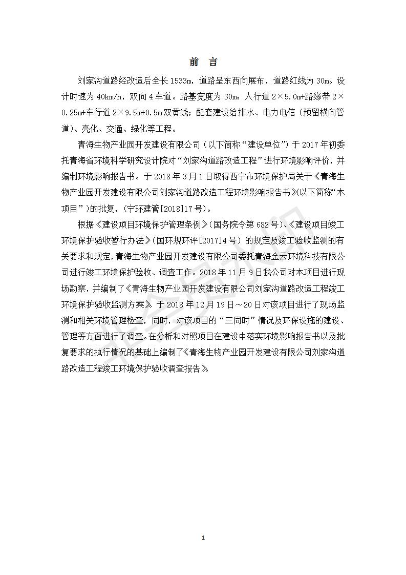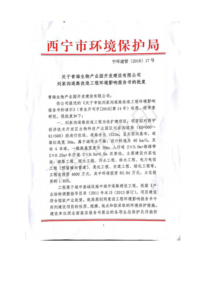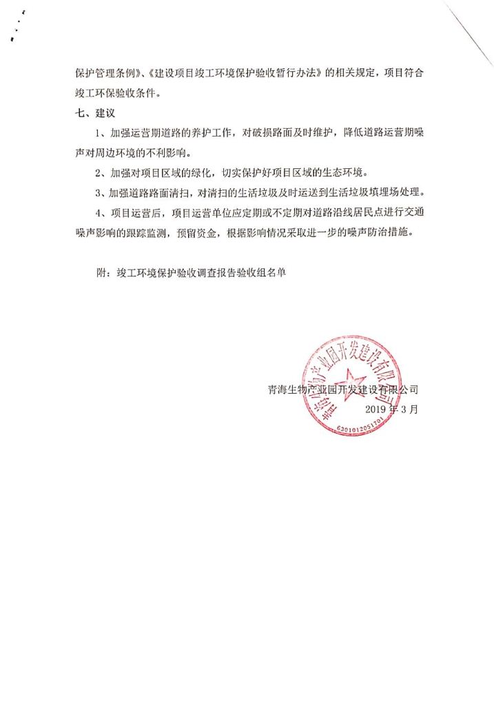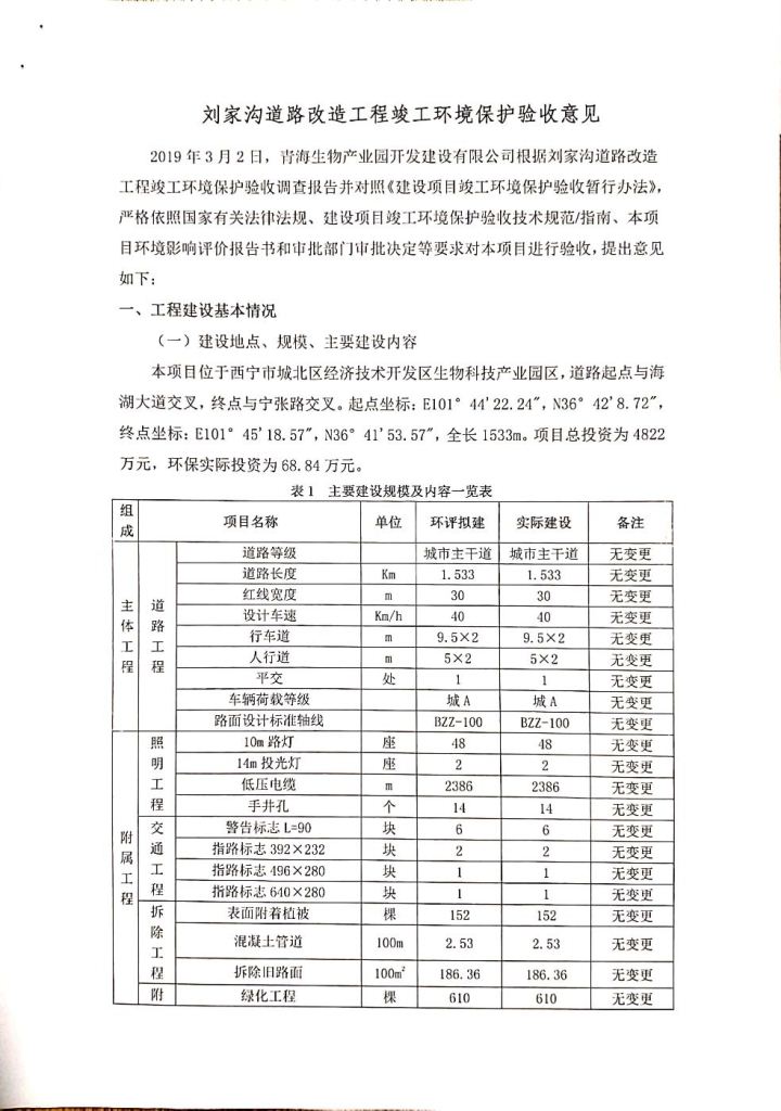 根據(jù)中華人民共和國務(wù)院令第682號(hào)《國務(wù)院關(guān)于修改〈建設(shè)項(xiàng)目環(huán)境保護(hù)管理?xiàng)l例〉的決定》和《建設(shè)項(xiàng)目竣工環(huán)境保護(hù)驗(yàn)收暫行辦法》(國務(wù)院令682號(hào)),劉家溝道路改造工程竣工環(huán)境保護(hù)驗(yàn)收內(nèi)容(包括竣工環(huán)境保護(hù)驗(yàn)收調(diào)查報(bào)告和驗(yàn)收意見)公示如下: 一、項(xiàng)目名稱:劉家溝道路改造工程 二、地點(diǎn):青海省西寧市城北區(qū)生物園區(qū) 三、建設(shè)單位:生物產(chǎn)業(yè)園開發(fā)建設(shè)有限公司 四、建設(shè)內(nèi)容:劉家溝道路經(jīng)改造后全長1533m,道路呈東西向展布,道路紅線為30m。設(shè)計(jì)時(shí)速為40km/h,雙向4車道。 五、公示時(shí)間:二〇一九年三月十四日至二〇一九年四月十一日 六、聯(lián)系人:張工 公示期間,對(duì)上述公示內(nèi)容如有異議,請(qǐng)以書面形式反饋,個(gè)人須署真實(shí)姓名,單位須加蓋公章。