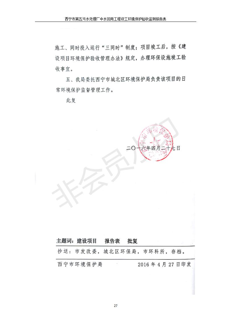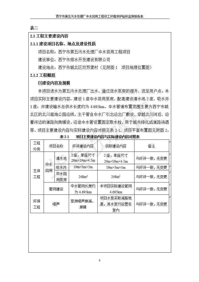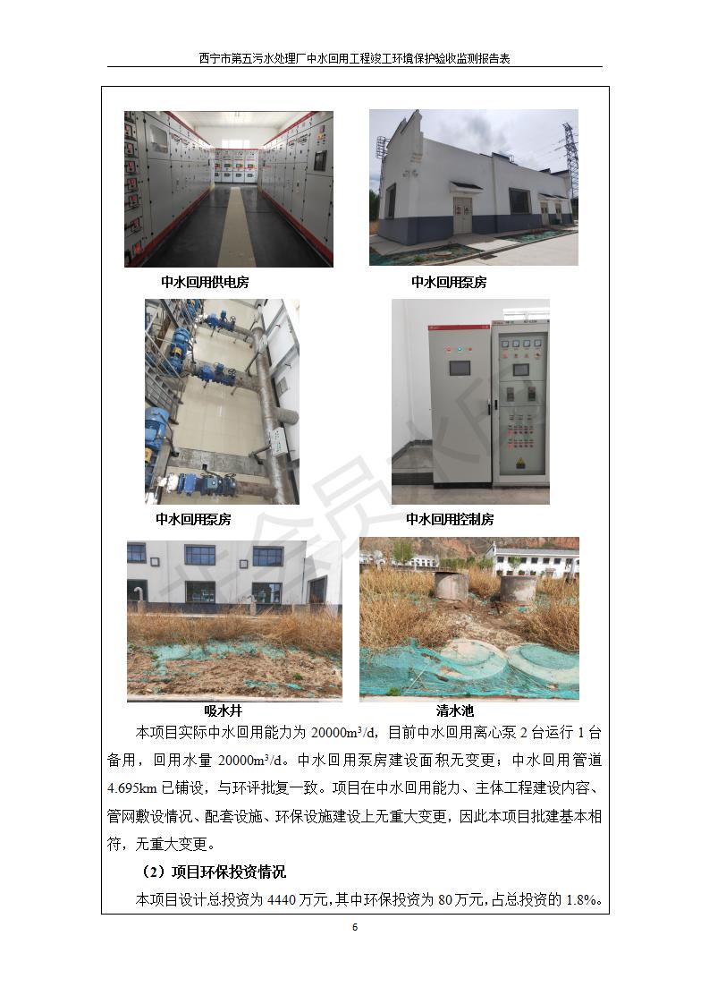 根據(jù)中華人民共和國(guó)國(guó)務(wù)院令第682號(hào)《國(guó)務(wù)院關(guān)于修改〈建設(shè)項(xiàng)目環(huán)境保護(hù)管理?xiàng)l例〉的決定》和《建設(shè)項(xiàng)目竣工環(huán)境保護(hù)驗(yàn)收暫行辦法》(國(guó)務(wù)院令682號(hào)),西寧市第五污水處理廠中水回用工程建設(shè)項(xiàng)目(包括竣工環(huán)境保護(hù)驗(yàn)收監(jiān)測(cè)報(bào)告表和驗(yàn)收意見(jiàn))公示如下。 一、項(xiàng)目名稱:西寧市第五污水處理廠中水回用工程建設(shè)項(xiàng)目 二、地點(diǎn):西寧市城北區(qū)廿十里鋪雙蘇堡 三、建設(shè)單位:西寧市排水開(kāi)發(fā)建設(shè)有限公司