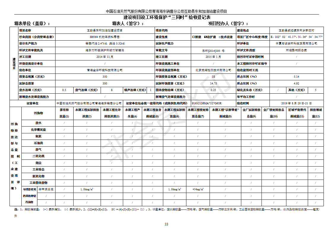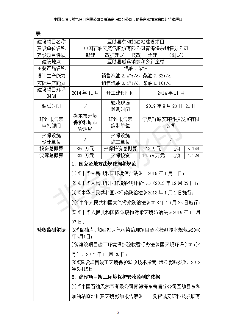 互助縣東和加油站原址擴建項目 竣工環(huán)境保護驗收監(jiān)測報告表公示發(fā)布日期:(2019-9-27) 點擊次數(shù):2457 |