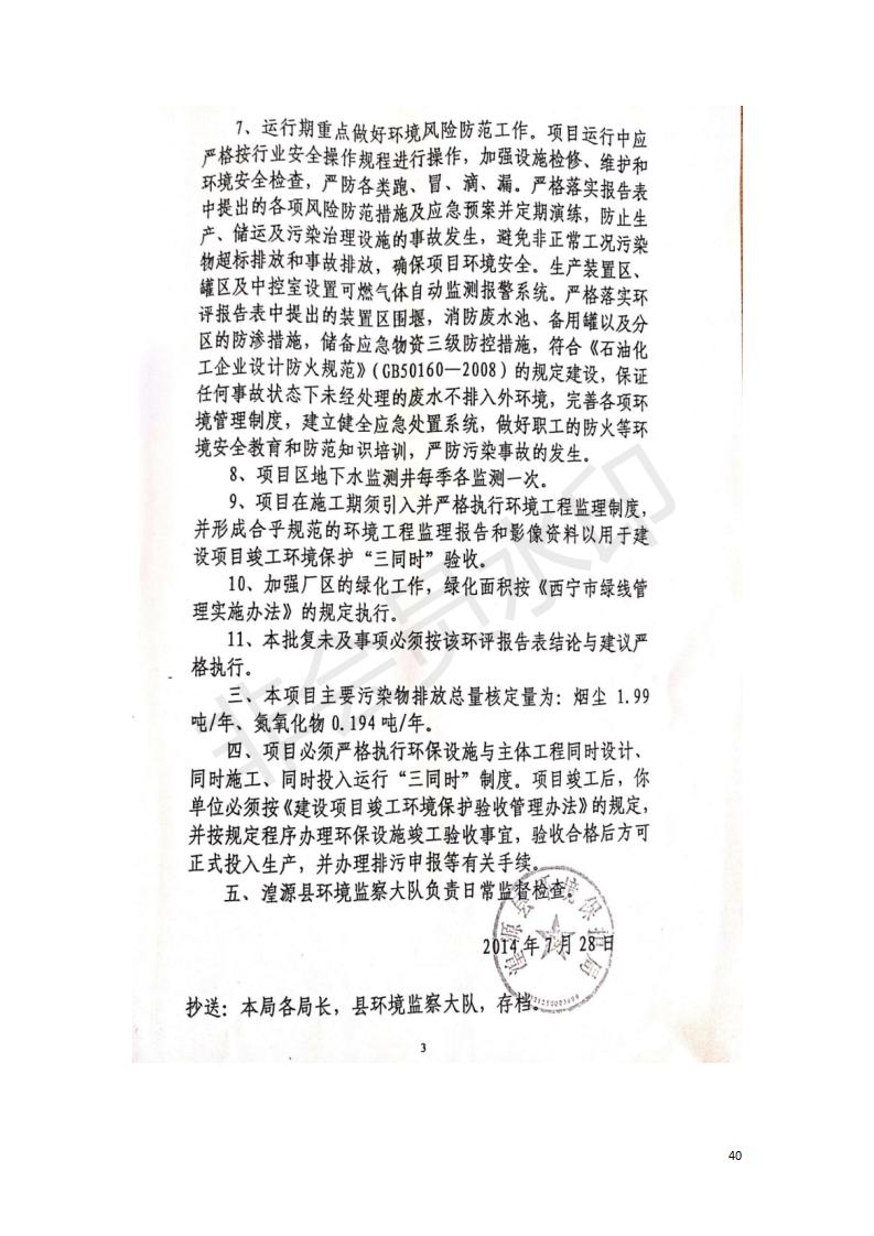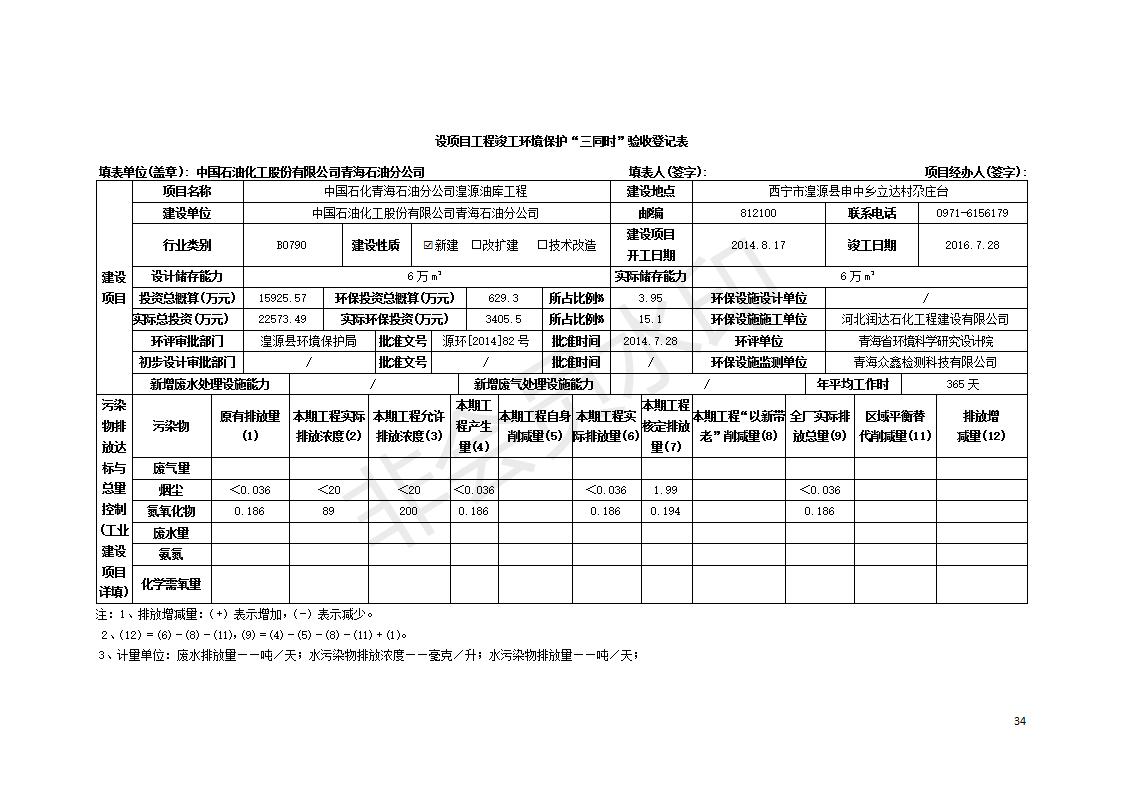 據(jù)中華人民共和國國務(wù)院令第682號《國務(wù)院關(guān)于修改〈建設(shè)項目環(huán)境保護管理條例〉的決定》和《建設(shè)項目竣工環(huán)境保護驗收暫行辦法》(國務(wù)院令682號),中國石化青海石油分公司湟源油庫工程建設(shè)項目(包括竣工環(huán)境保護驗收監(jiān)測報告表和驗收意見)公示如下。 一、項目名稱:中國石化青海石油分公司湟源油庫工程建設(shè)項目 二、地點:西寧市湟源縣申中鄉(xiāng)立達村尕莊臺 三、建設(shè)單位:中國石化銷售股份有限公司青海石油分公司 四、建設(shè)內(nèi)容:油品儲量6萬m3、其他配套設(shè)施。五、聯(lián)系人:董恒棟 六、聯(lián)系電話:18697130811 七、公示時間:二〇二〇年三月十三日至二〇二〇年四月十日 公示期間,對上述公示內(nèi)容如有異議,請以書面形式反饋,個人須署真實姓名,單位須加蓋公章。