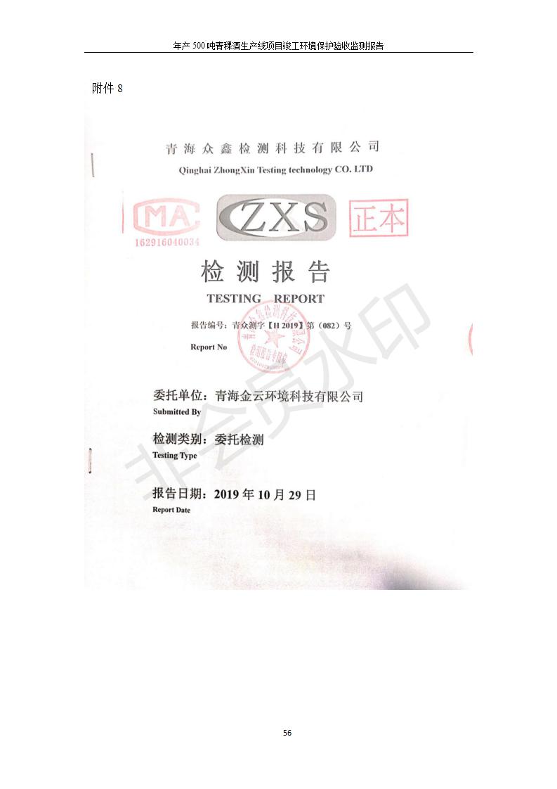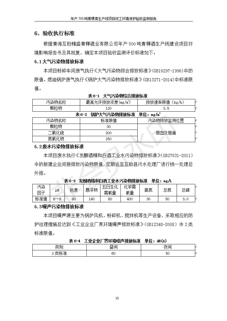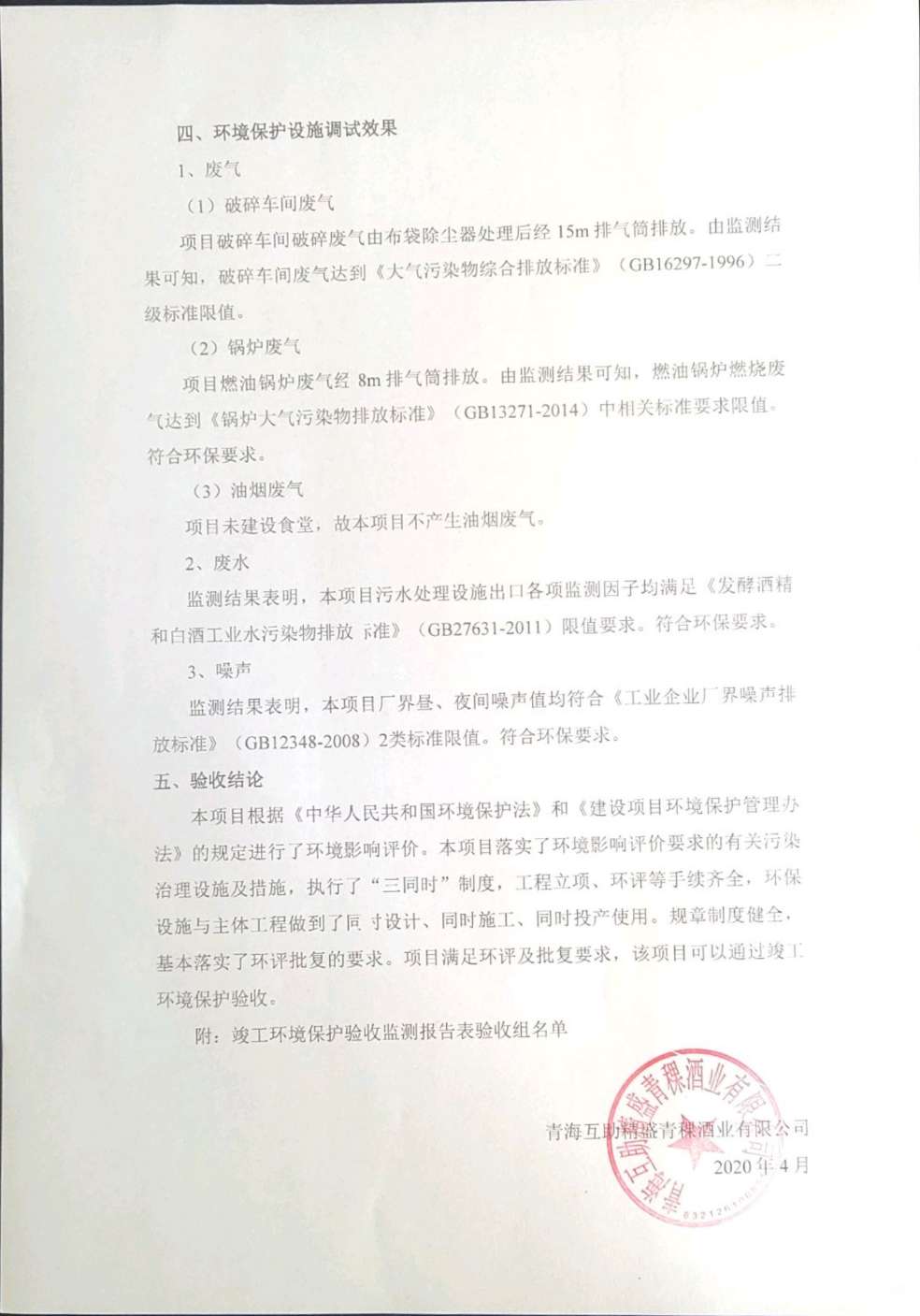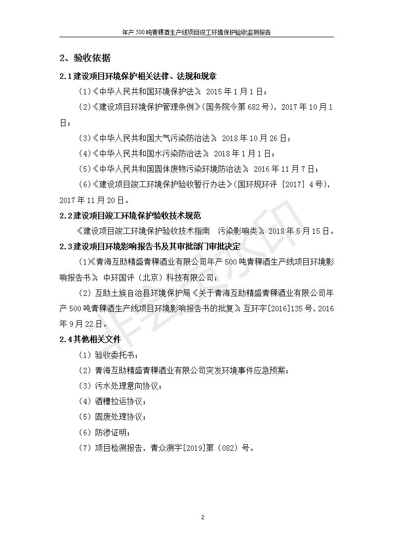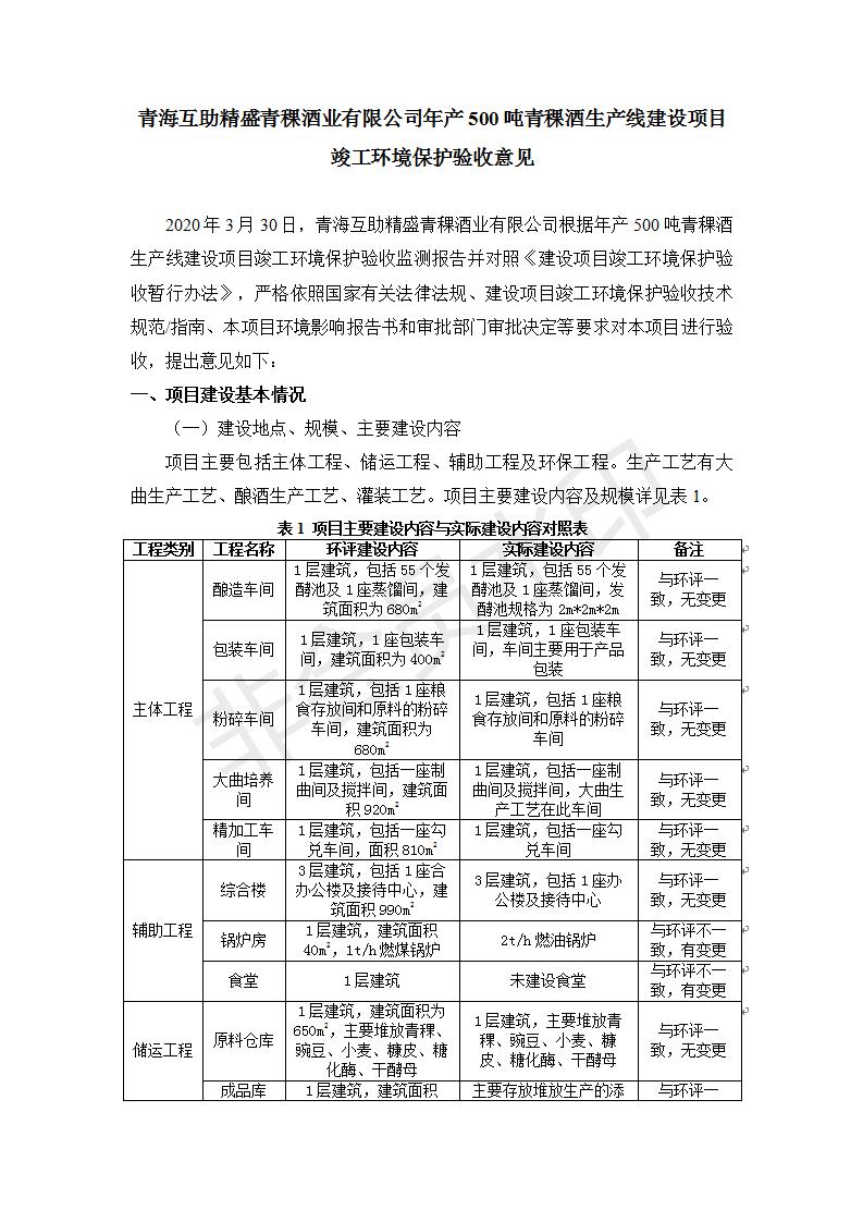 根據(jù)中華人民共和國國務(wù)院令第682號《國務(wù)院關(guān)于修改〈建設(shè)項(xiàng)目環(huán)境保護(hù)管理?xiàng)l例〉的決定》和《建設(shè)項(xiàng)目竣工環(huán)境保護(hù)驗(yàn)收暫行辦法》(國務(wù)院令682號),綜合檢測實(shí)驗(yàn)室建設(shè)項(xiàng)目(包括竣工環(huán)境保護(hù)驗(yàn)收監(jiān)測報(bào)告表和驗(yàn)收意見)公示如下。 一、項(xiàng)目名稱:青;ブ⑶囡茦I(yè)有限公司年產(chǎn)500噸青稞酒業(yè)生產(chǎn)線建設(shè)項(xiàng)目 二、地點(diǎn):青海省海東市互助土族自治縣臺子鄉(xiāng)河?xùn)|村198號