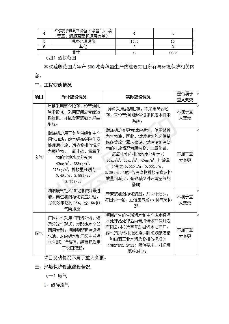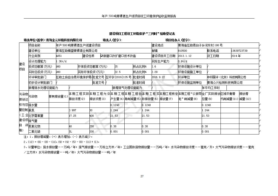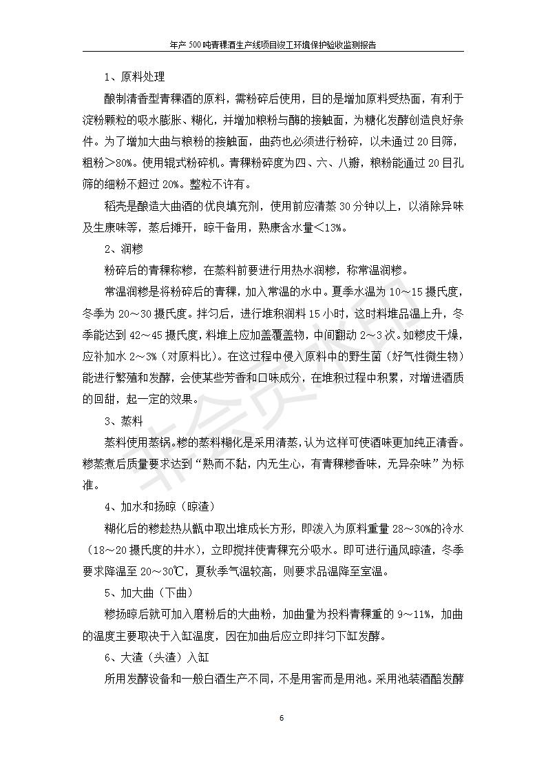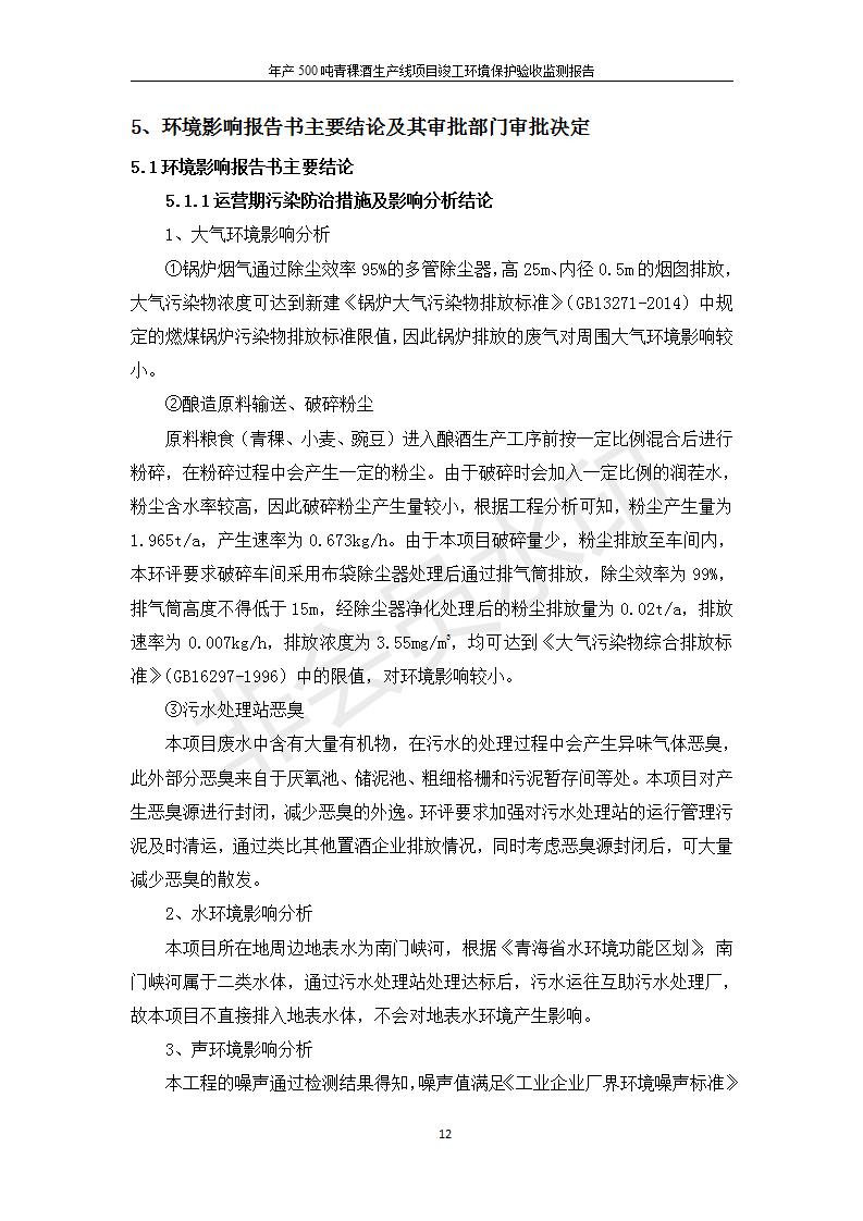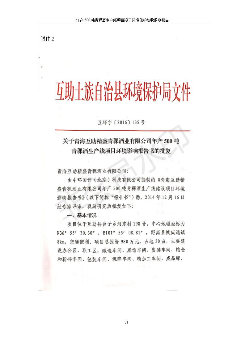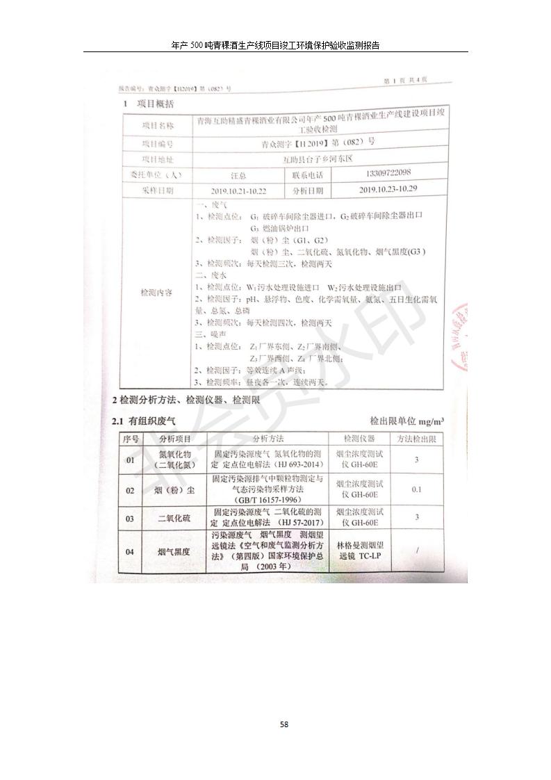 根據(jù)中華人民共和國國務(wù)院令第682號《國務(wù)院關(guān)于修改〈建設(shè)項(xiàng)目環(huán)境保護(hù)管理?xiàng)l例〉的決定》和《建設(shè)項(xiàng)目竣工環(huán)境保護(hù)驗(yàn)收暫行辦法》(國務(wù)院令682號),綜合檢測實(shí)驗(yàn)室建設(shè)項(xiàng)目(包括竣工環(huán)境保護(hù)驗(yàn)收監(jiān)測報(bào)告表和驗(yàn)收意見)公示如下。 一、項(xiàng)目名稱:青;ブ⑶囡茦I(yè)有限公司年產(chǎn)500噸青稞酒業(yè)生產(chǎn)線建設(shè)項(xiàng)目 二、地點(diǎn):青海省海東市互助土族自治縣臺子鄉(xiāng)河?xùn)|村198號
