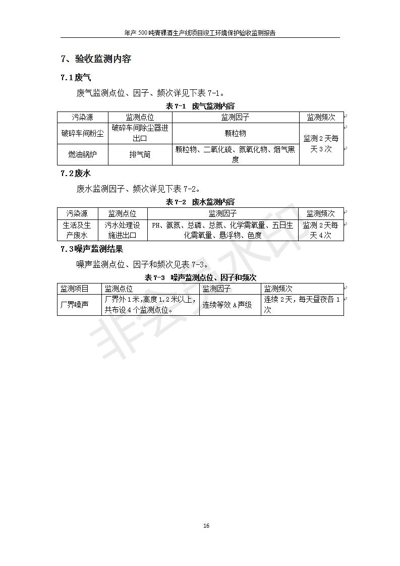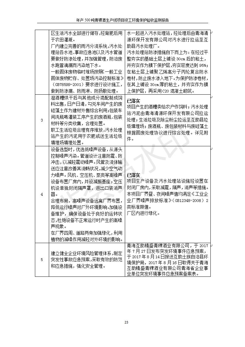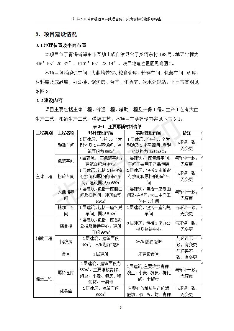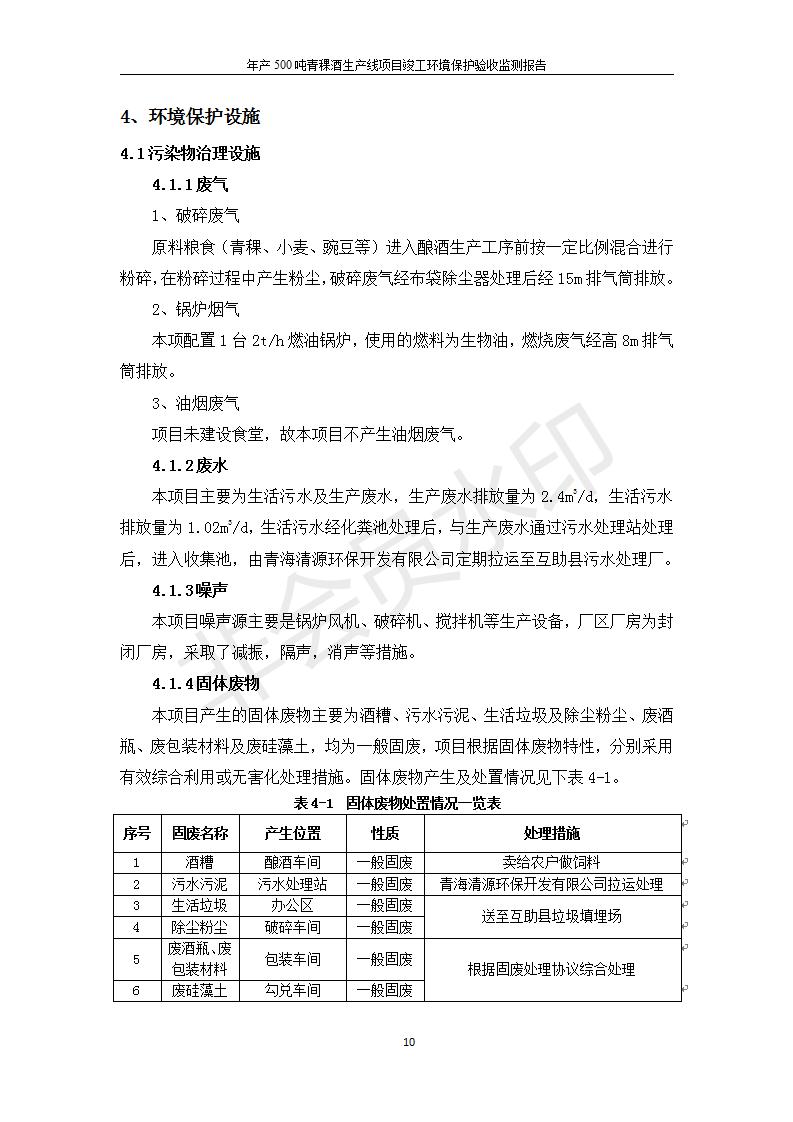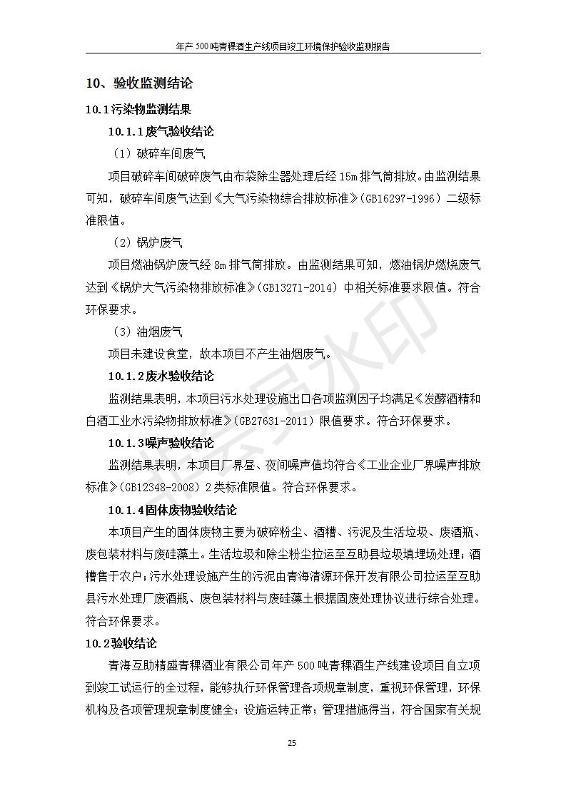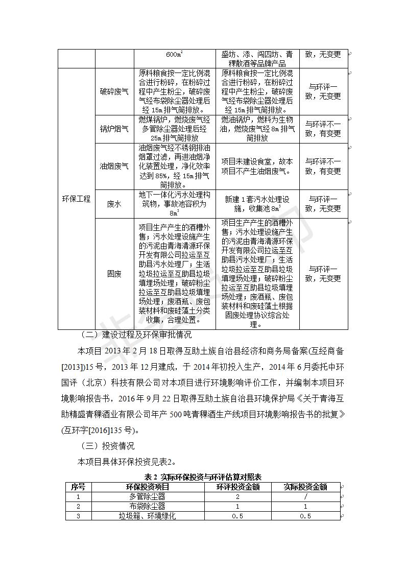 根據(jù)中華人民共和國國務(wù)院令第682號《國務(wù)院關(guān)于修改〈建設(shè)項(xiàng)目環(huán)境保護(hù)管理?xiàng)l例〉的決定》和《建設(shè)項(xiàng)目竣工環(huán)境保護(hù)驗(yàn)收暫行辦法》(國務(wù)院令682號),綜合檢測實(shí)驗(yàn)室建設(shè)項(xiàng)目(包括竣工環(huán)境保護(hù)驗(yàn)收監(jiān)測報(bào)告表和驗(yàn)收意見)公示如下。 一、項(xiàng)目名稱:青;ブ⑶囡茦I(yè)有限公司年產(chǎn)500噸青稞酒業(yè)生產(chǎn)線建設(shè)項(xiàng)目 二、地點(diǎn):青海省海東市互助土族自治縣臺子鄉(xiāng)河?xùn)|村198號
