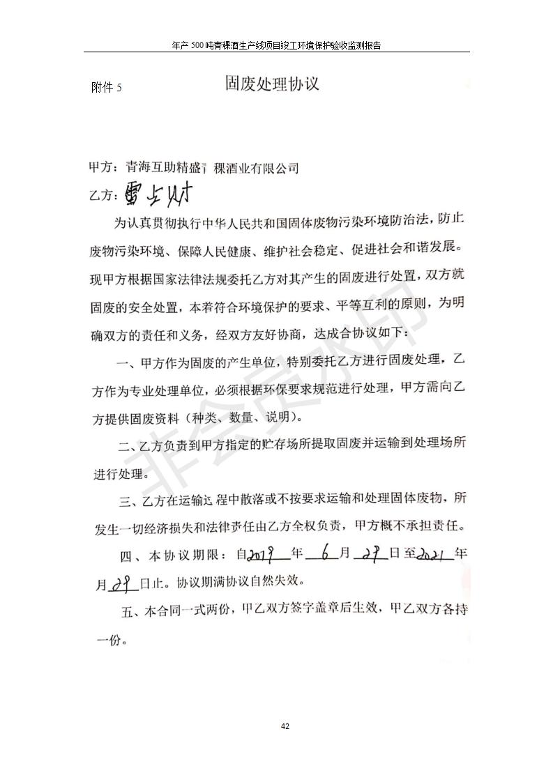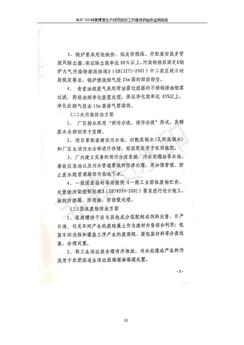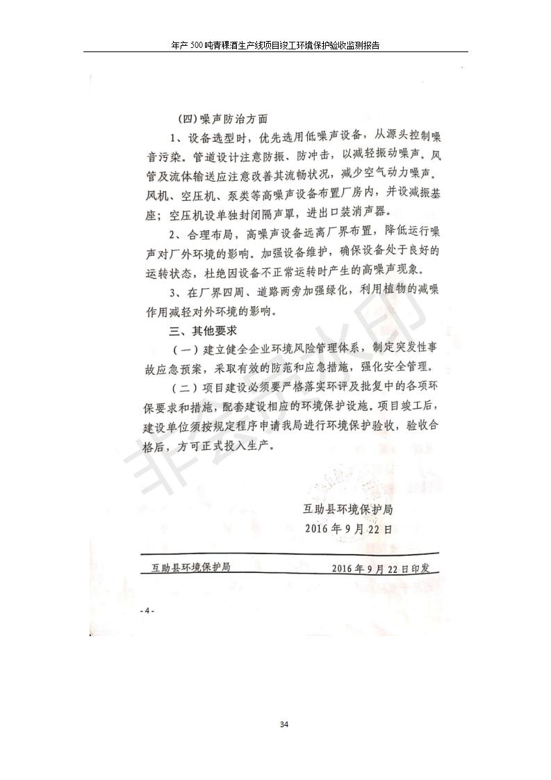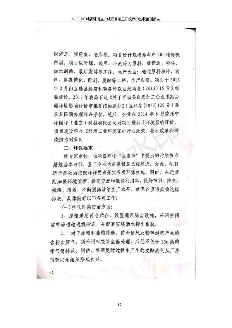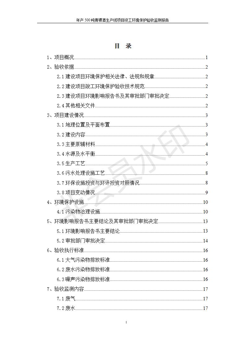 根據(jù)中華人民共和國國務(wù)院令第682號《國務(wù)院關(guān)于修改〈建設(shè)項(xiàng)目環(huán)境保護(hù)管理?xiàng)l例〉的決定》和《建設(shè)項(xiàng)目竣工環(huán)境保護(hù)驗(yàn)收暫行辦法》(國務(wù)院令682號),綜合檢測實(shí)驗(yàn)室建設(shè)項(xiàng)目(包括竣工環(huán)境保護(hù)驗(yàn)收監(jiān)測報(bào)告表和驗(yàn)收意見)公示如下。 一、項(xiàng)目名稱:青;ブ⑶囡茦I(yè)有限公司年產(chǎn)500噸青稞酒業(yè)生產(chǎn)線建設(shè)項(xiàng)目 二、地點(diǎn):青海省海東市互助土族自治縣臺子鄉(xiāng)河?xùn)|村198號