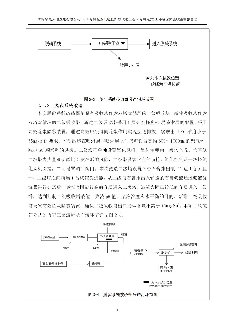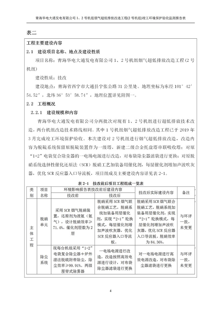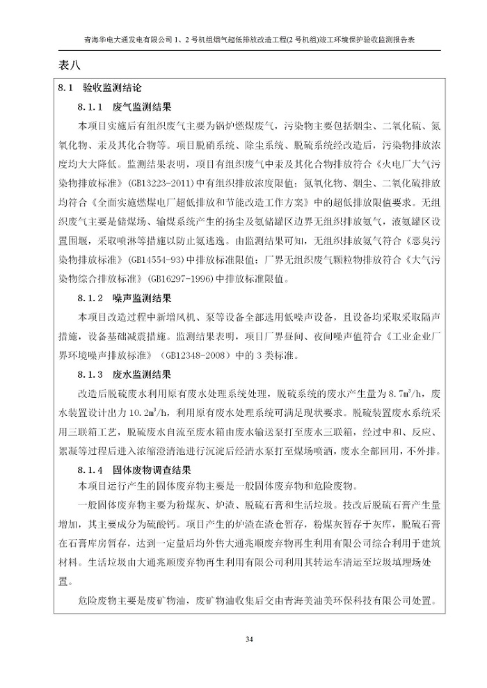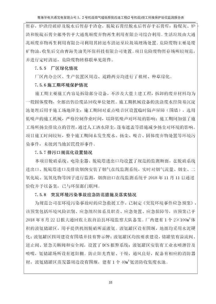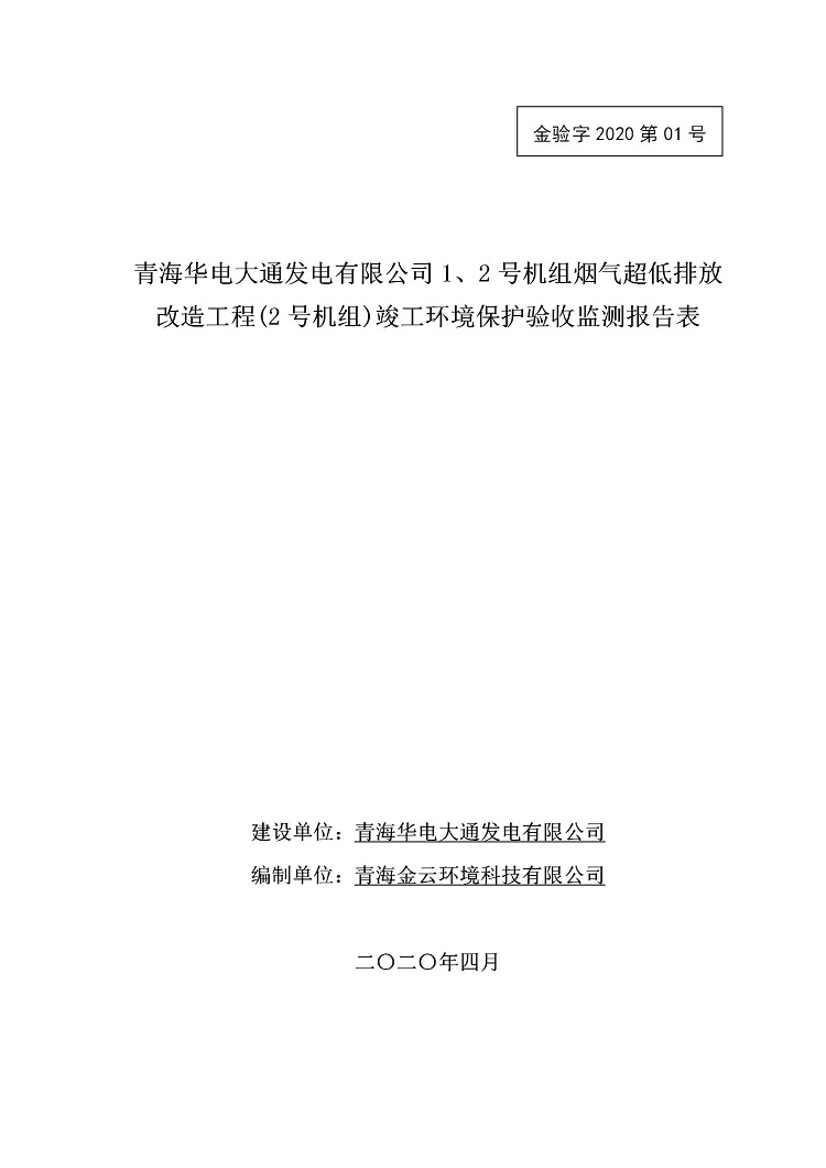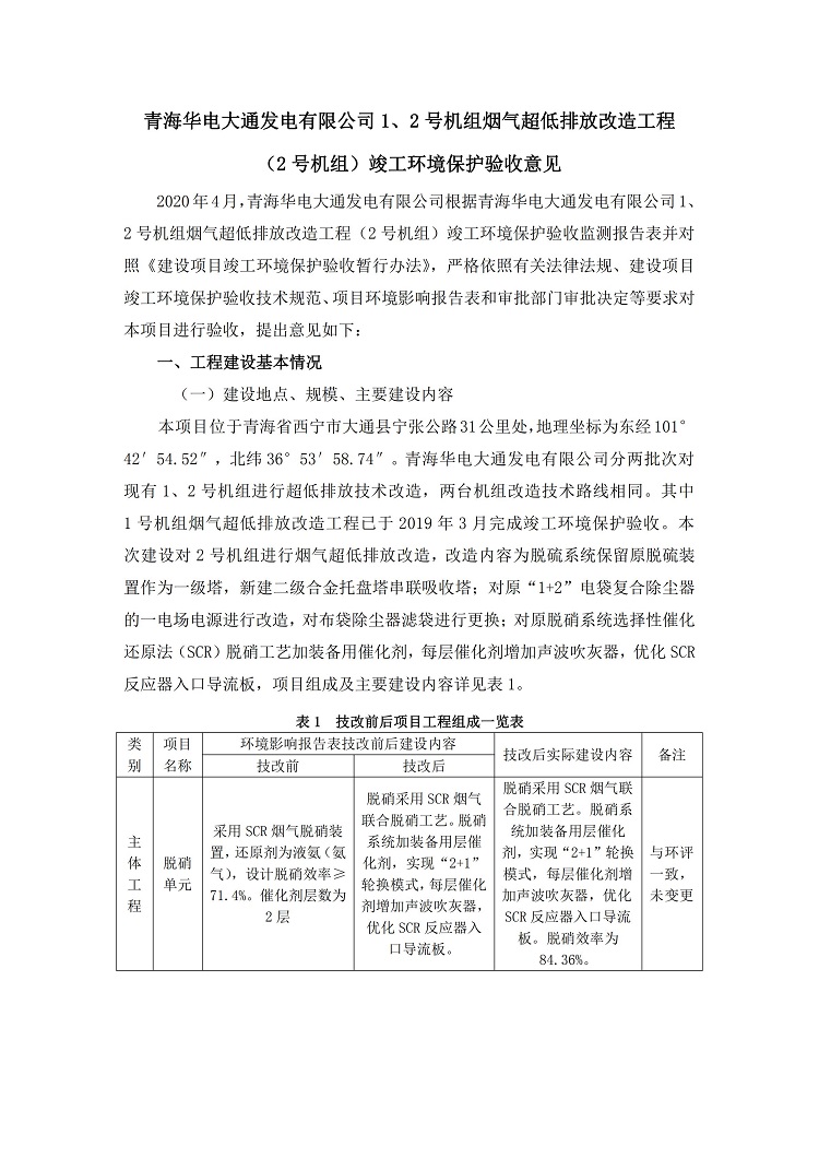 根據(jù)中華人民共和國國務(wù)院令第682號《國務(wù)院關(guān)于修改〈建設(shè)項目環(huán)境保護(hù)管理條例〉的決定》和《建設(shè)項目竣工環(huán)境保護(hù)驗收暫行辦法》(國務(wù)院令682號),青海華電大通發(fā)電有限公司1、2號機(jī)組煙氣超低排放改造工程(2號機(jī)組) (包括竣工環(huán)境保護(hù)驗收監(jiān)測報告表和驗收意見)公示如下。 一、項目名稱:青海華電大通發(fā)電有限公司1、2號機(jī)組煙氣超低排放改造工程(2號機(jī)組) 竣工環(huán)境保護(hù)驗收監(jiān)測報告表 二、地點(diǎn):青海省西寧市大通縣寧張公路31公里處 三、建設(shè)單位:青海華電大通發(fā)電有限公司 四、建設(shè)內(nèi)容:2號機(jī)組煙氣超低排放改造,2號機(jī)組改造內(nèi)容為脫硫系統(tǒng)保留原脫硫裝置作為一級塔,新建二級合金托盤塔串聯(lián)吸收塔;對原“1+2”電袋復(fù)合除塵器的一電場電源進(jìn)行改造,對布袋除塵器濾袋進(jìn)行更換;對原脫硝系統(tǒng)選擇性催化還原法(SCR)脫硝工藝加裝備用催化劑,每層催化劑增加聲波吹灰器,優(yōu)化SCR反應(yīng)器入口導(dǎo)流板。 五、聯(lián)系人:馬世敏 六、聯(lián)系電 話:0971-6515411 七、公示時間:二〇二〇年四月二十九日至二〇二〇年五月二十八日 公示期間,對上述公示內(nèi)容如有異議,請以書面形式反饋,個人須署真實姓名,單位須加蓋公章。