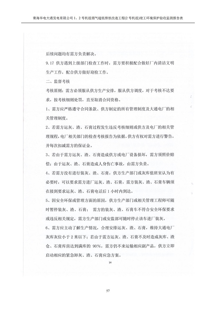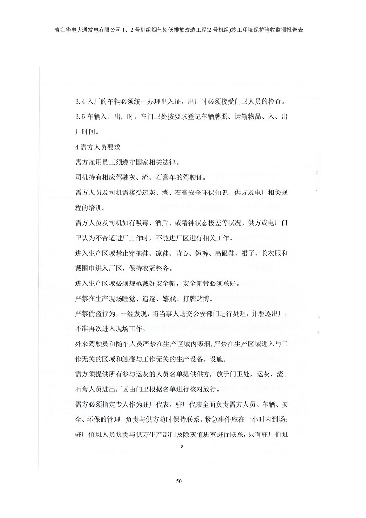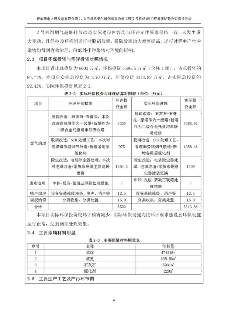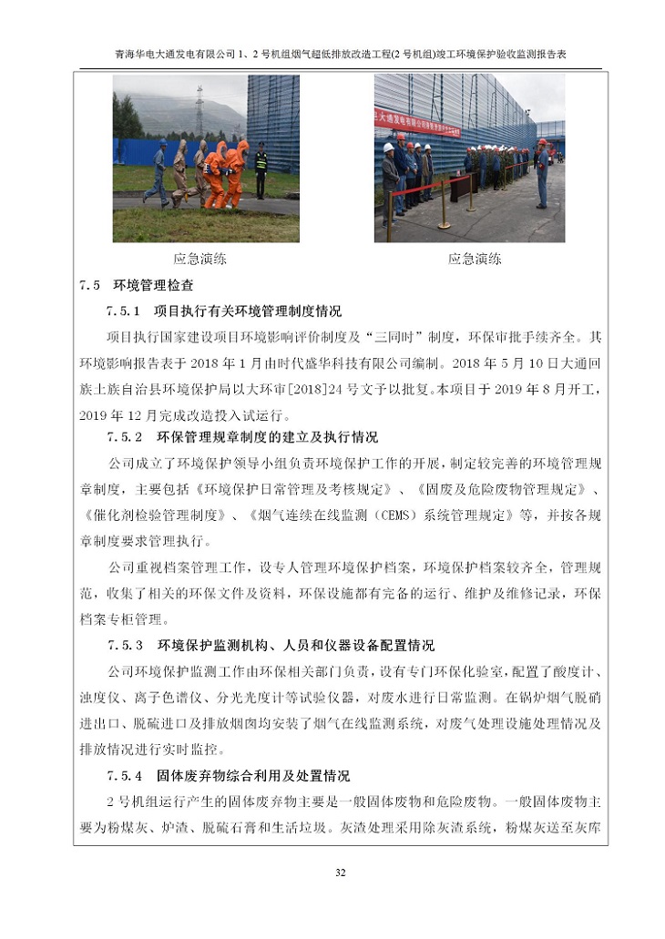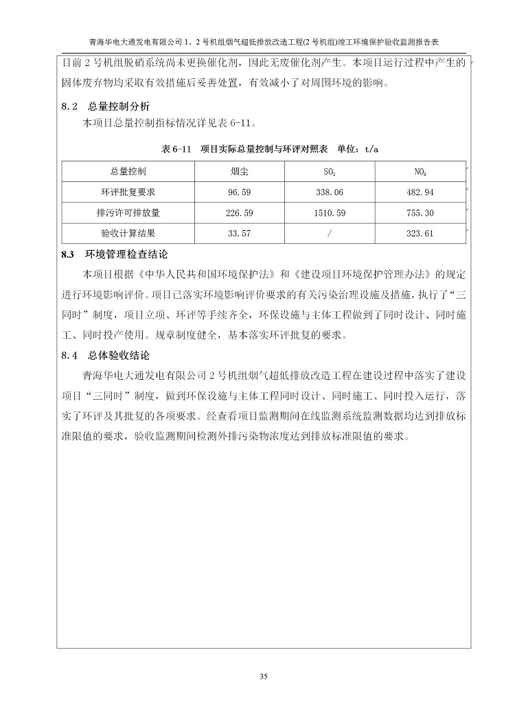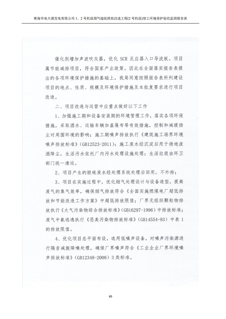 根據(jù)中華人民共和國國務(wù)院令第682號《國務(wù)院關(guān)于修改〈建設(shè)項目環(huán)境保護(hù)管理條例〉的決定》和《建設(shè)項目竣工環(huán)境保護(hù)驗收暫行辦法》(國務(wù)院令682號),青海華電大通發(fā)電有限公司1、2號機(jī)組煙氣超低排放改造工程(2號機(jī)組) (包括竣工環(huán)境保護(hù)驗收監(jiān)測報告表和驗收意見)公示如下。 一、項目名稱:青海華電大通發(fā)電有限公司1、2號機(jī)組煙氣超低排放改造工程(2號機(jī)組) 竣工環(huán)境保護(hù)驗收監(jiān)測報告表 二、地點(diǎn):青海省西寧市大通縣寧張公路31公里處 三、建設(shè)單位:青海華電大通發(fā)電有限公司 四、建設(shè)內(nèi)容:2號機(jī)組煙氣超低排放改造,2號機(jī)組改造內(nèi)容為脫硫系統(tǒng)保留原脫硫裝置作為一級塔,新建二級合金托盤塔串聯(lián)吸收塔;對原“1+2”電袋復(fù)合除塵器的一電場電源進(jìn)行改造,對布袋除塵器濾袋進(jìn)行更換;對原脫硝系統(tǒng)選擇性催化還原法(SCR)脫硝工藝加裝備用催化劑,每層催化劑增加聲波吹灰器,優(yōu)化SCR反應(yīng)器入口導(dǎo)流板。 五、聯(lián)系人:馬世敏 六、聯(lián)系電 話:0971-6515411 七、公示時間:二〇二〇年四月二十九日至二〇二〇年五月二十八日 公示期間,對上述公示內(nèi)容如有異議,請以書面形式反饋,個人須署真實姓名,單位須加蓋公章。
